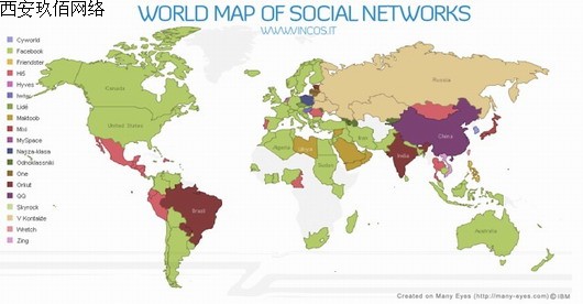 從這張地圖可以看出,雖然Facebook席卷全球,但在很多國家卻遭遇了不同社交網站的抵抗,圖中綠色區域為Facebook勢力范圍。在俄羅斯,V Kontakte統治著社交網站;在中國,QQ排名第一;在巴西和印度,主要對手是Orkut;在中美洲、秘魯、蒙古和泰國,hi5最受歡迎;在韓國Cyworld大行其道;日本網民最愛mixi;中東地區是Maktoob;菲律賓網民最支持Friendster。