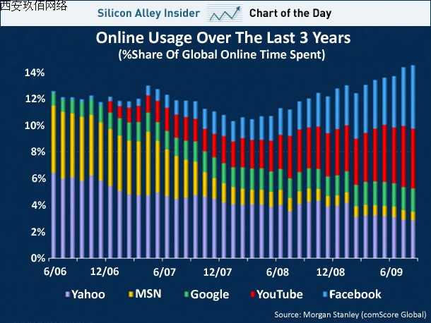 YouTube和Facebook在網民上網時間中的比例在迅速提高,雅虎和MSN則出現滑坡,Google變化不大。
