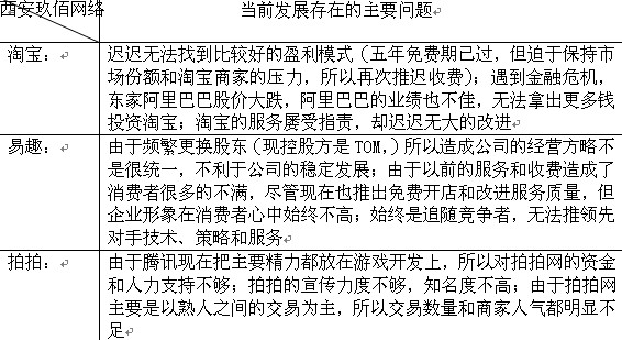另外一點(diǎn)值得注意的是,據(jù)數(shù)據(jù)顯示,二三線城市正在逐漸成為網(wǎng)購(gòu)市場(chǎng)的主力軍,福建、山東、湖北、遼寧、四川等二三線地區(qū)排名迅速上升,成為網(wǎng)購(gòu)的主力,這些地區(qū)的網(wǎng)購(gòu)交易額已經(jīng)占到總交易額的一半左右。而且這種趨勢(shì)還會(huì)維持下去,面對(duì)C2C這個(gè)在中國(guó)蓬勃發(fā)展的領(lǐng)域,百度這時(shí)的切入應(yīng)該說(shuō)是恰到好處的。 。ǘ┲饕(jìng)爭(zhēng)對(duì)手均遇到麻煩