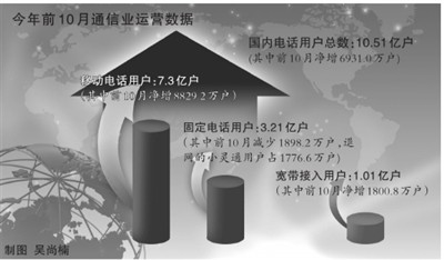 記者昨天從工業(yè)和信息化部了解到,截至10月底,我國的電話用戶總數已達到10.51億戶。同時,今年累計新增互聯網寬帶用戶1800.8萬戶,寬帶用戶總數突破億戶大關。