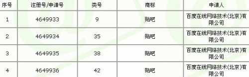 根據(jù)“中國(guó)商標(biāo)網(wǎng)”查詢獲得的信息,百度在線注冊(cè)獲得了4個(gè)類號(hào)的“貼吧”商標(biāo),包括科學(xué)技術(shù)服務(wù)和與之相關(guān)的研究與設(shè)計(jì)服務(wù);工業(yè)分析與研究;計(jì)算機(jī)硬件與軟件的設(shè)計(jì)與開發(fā);法律服務(wù);電信;廣告;實(shí)業(yè)經(jīng)營(yíng);實(shí)業(yè)管理;辦公事務(wù)等適用范圍。