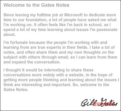 蓋茨表示,網站內容將每周更新三次,有些是簡短留言,有些將是深度剖析。蓋茨說:“我很樂意分享,并期待大家的回復,這對我會有很大幫助。”