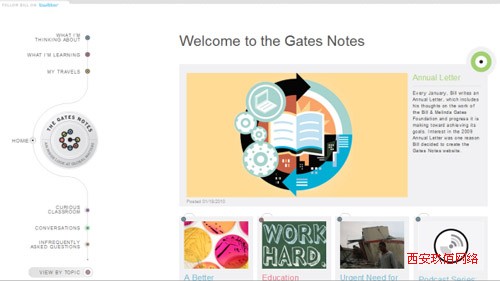 目前,網站已經正式開通(http://www.gatesnotes.com/),最初主要內容包括教育改革、甲流、海地地震等方面內容。而就在一天前,蓋茨剛剛成為微型博客Twitter的用戶。