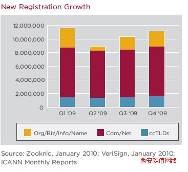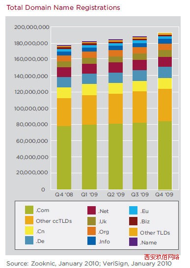 從2008年底以來,全球新增域名注冊數(shù)約為1500萬個,這意味著域名注冊總數(shù)跨越2億大關(guān)就在本季度或下季度。2009年第四季度,域名注冊總數(shù)環(huán)比增 加了2%,同比增加了8%。