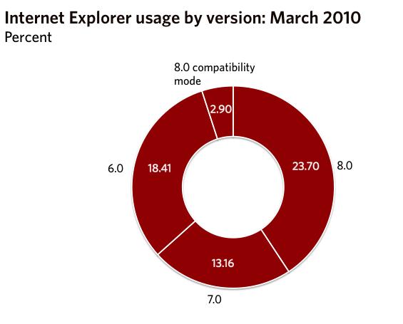 來單獨看一下IE各版本的份額狀況,IE8已經是使用率最高的IE版本了,約四分之一的網民都在使用IE8。雖然IE6的整體份額較IE7要高,但是它卻出現了1.35個百分點的下跌,IE7的情況則稍好一些,下跌了0.41%。
