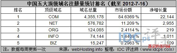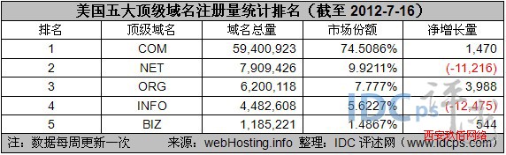 (圖3)美國五大頂級域名注冊量統(tǒng)計排名(截至2012-7-16)