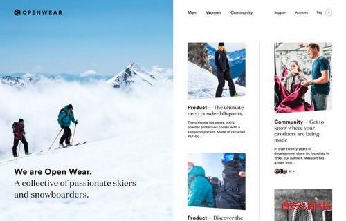 Open Wear 這個網站同樣采用了分屏式的布局,不過兩側內容的輕重屬性均不相同,這樣的不對稱使得用戶會更自然地瀏覽右側的內容頁。 由于圖片素材的大量運用,整個設計顯得更加開放。雖然頁面中元素并不少,但是整個布局設計顯得足夠通透開放。
