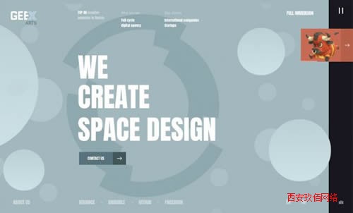 Geex Arts 在頁面的右側(cè)加入了一個(gè)黑色的垂直條,用一個(gè)小的暫停按鈕和小巧的動(dòng)態(tài)圖片來吸引你切換頁面。小巧的導(dǎo)航被置于頁面底部。