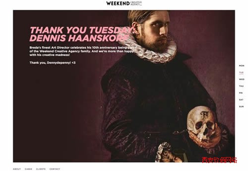Weekend Creative Agency 的導(dǎo)航欄同樣置于側(cè)邊欄,不過是在左側(cè),所有的鏈接都擺在明面上,但是從名稱到樣式都非常的簡約小巧。