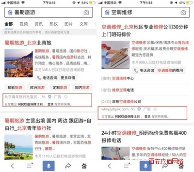 隨著暑期的到來,有用戶反映在使用百度App搜索“暑期旅游”、“空調維修”等關鍵詞時,在搜索結果中的廣告內容下方,除了原有的廣告標識外,新增加了一個藍色的盾牌型“保”字標識。用戶點擊該標識后,頁面內會彈出“網民權益保障計劃”的入口,繼續(xù)點擊可以進入網民權益保障計劃申保頁面。