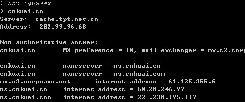 4、查詢域名MX記錄(郵件記錄,郵局指向),輸入:set type=mx,回車,進入MX記錄查詢模塊,然輸入您要查詢的域名,回車后,即可查詢到該域名的MX記錄解析詳情(如下圖);