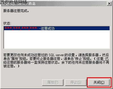 9、顯示注冊成功。(如果總是提示失敗,請檢查您的局域網(wǎng)是否開放了1433端口,同時(shí)檢查您的SQL鏈接超時(shí)時(shí)間,SQL默認(rèn)超時(shí)時(shí)間為4秒,建議改成60秒---在SQL server 企業(yè)管理器=>工具=>選項(xiàng)=>高級(jí)。)