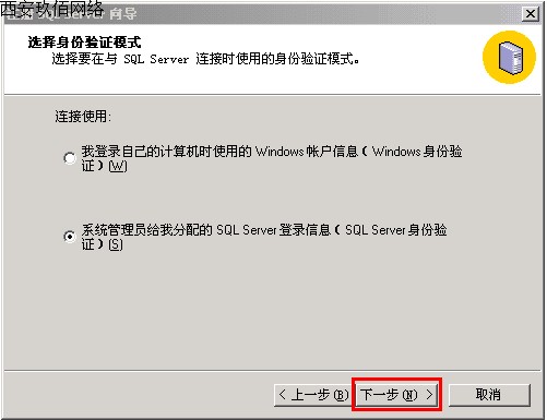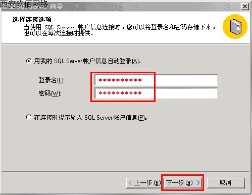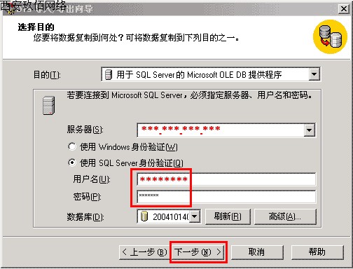 7、按下圖所示,按您的訂單中顯示的SQL用戶名和密碼,分別填寫后,點(diǎn)下一步;