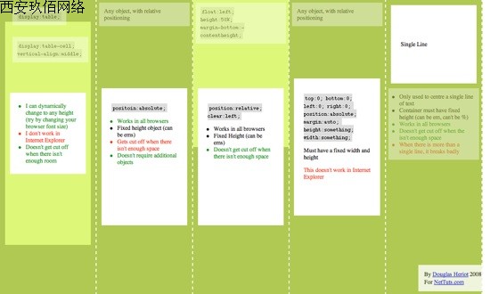 這個方法把一些 div 的顯示方式設置為表格,因此我們可以使用表格的 vertical-align property 屬性。