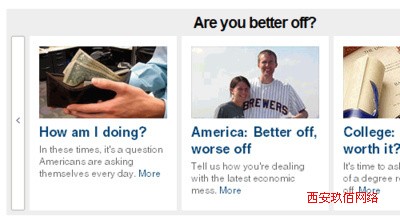 這種形式的好處是,用戶可以不用多次點(diǎn)擊來搜尋他們感興趣的內(nèi)容,可以快速的通過滾動幻燈片來瀏覽希望他們注意的內(nèi)容。這種形式多用于娛樂站點(diǎn),或者是一些大型博客。是一種非常吸引眼球的展示方式。