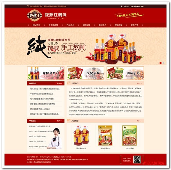 甘肅安吉紅食品有限責任公司 http://www.lyhtw.com/ 通過傳統(tǒng)工藝與現(xiàn)代科技相結(jié)合,由多名專業(yè)食品工程師精心研制出更合現(xiàn)代人口味的“隴源紅”牌原味辣椒油、火鍋底料、豆瓣醬、黃豆醬等系列產(chǎn)品投放市場,方便了人們的生活。隴源紅調(diào)味品暢銷全國二十多個省市,深受消費者的青睞。