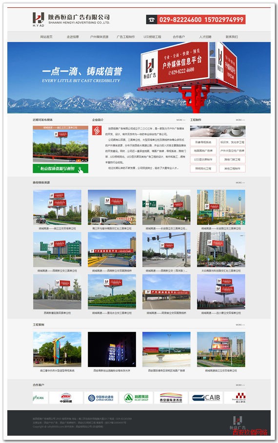 陜西恒意廣告有限公司成立于二〇〇三年,是一家致力于戶外廣告媒體的開發、設計、制作及發布為一體的專業綜合性廣告公司。公司擁有以雙面、三面單立柱、大型雙塔單立柱及跨線橋體等眾多形式的戶外媒體資源,分布于陜西各大高速公路,并全力投入對各主要路段媒體的開發建設。同時,公司還一直承攬地面、墻面廣告牌,導視系統,跨街門架,LED照明亮化、LED顯示屏及其他廣告工程的設計、制作和施工,擁有豐富的行業經驗。恒意廣告2015新版網站以更加簡潔、大氣的形式突顯企業實力,突出展示優質媒體資源,提升企業品牌形象。